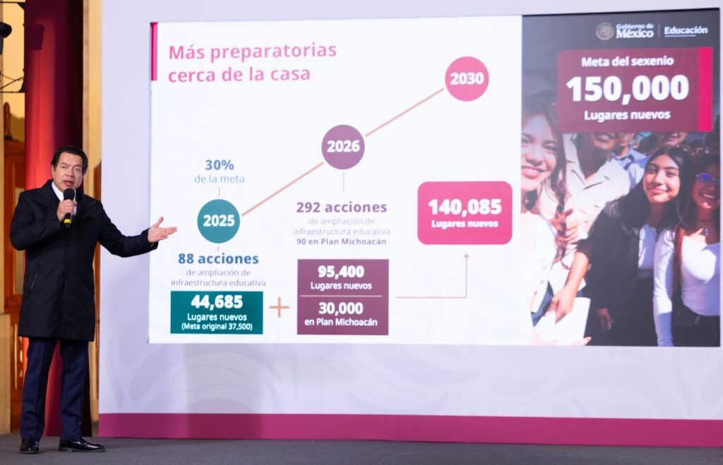El secretario de Educación Pública, Mario Delgado, detalló que la meta del sexenio pasó de 120 mil nuevos lugares a 150 mil; por esta razón, en 2025 se elevó de 37 mil 500 a 44 mil 685 espacios con 88 acciones: 20 planteles nuevos, cuyas construcciones están en cerca del 90 por ciento; 33 ampliaciones, de las que nueve ya fueron concluidas, 17 se entregarán en enero, cuatro más en febrero, dos en marzo y una en julio; así como 35 reconversiones, de las que 13 ya fueron terminadas, seis se abrirán en enero, 10 en febrero, 2 en marzo y una en abril. Mientras que en 2026 se realizarán 292 acciones para crear 95 mil 400 espacios, con lo que se tendrá un acumulado de 140 mil 85 lugares.
