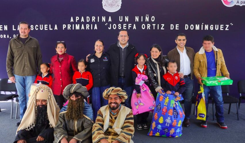 Corregidora, Qro., 16 de enero de 2026.- El presidente municipal de Corregidora, Chepe Guerrero, junto con miembros de su gabinete y regidores, entregaron juguetes y ropa a niñas y niños de la escuela primaria Josefa Ortiz de Domínguez, en la comunidad de El Progreso, con quienes compartieron rosca de reyes, como parte del programa “Apadrina un niño”, organizado por el DIF municipal.