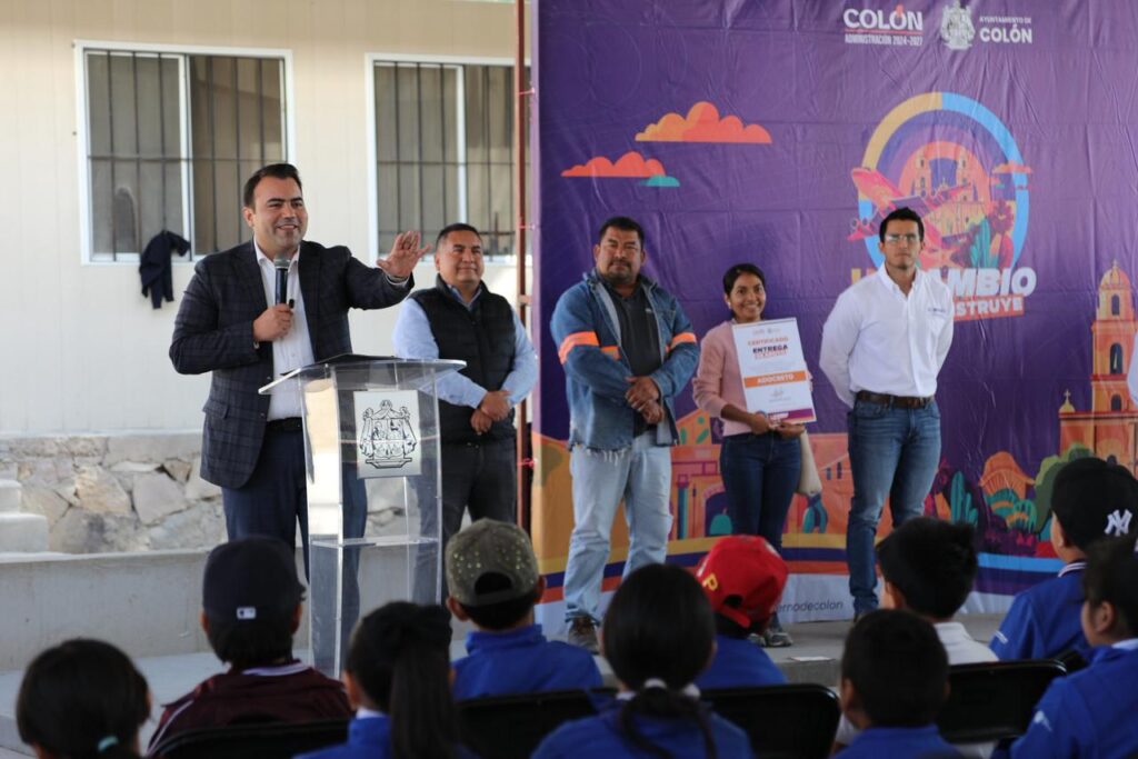 Colón, Qro., 28 de enero de 2026.- En gira de trabajo, el presidente municipal, Gaspar Trueba Moncada, acudió a la comunidad de La Esperanza para presidir la ceremonia de entrega de adocreto para las escuelas primarias “J. Guadalupe Velázquez” turno matutino y “Octavio Paz” turno vespertino; acompañado de los directores de estos planteles de educación básica, Maricela Hernández Chico y Ramiro Lora Hernández, respectivamente.