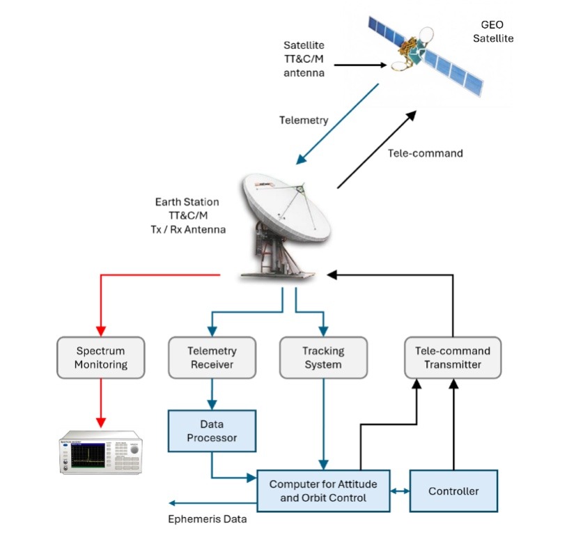 El segmento terrestre es el componente esencial que asegura la operatividad y el mantenimiento de la salud y la posición orbital precisa de un satélite geoestacionario (GEO) o satélites posicionados en la órbita baja terrestre (LEO), además de realizar funciones críticas como: seguimiento, bajada de la telemetría y envío de comandos. Su función esencial radica en garantizar la continuidad, la seguridad y la rentabilidad de los activos orbitales a lo largo de su vida útil. Esto requiere la gestión integrada de complejas disciplinas de ingeniería, desde la propulsión y la dinámica orbital hasta coordinación del espectro de frecuencias y el cumplimiento regulatorio nacional e internacional. La órbita GEO es muy utilizada para brindar servicio fijo por satélite, ya que los satélites parecen estar fijos en el cielo, permitiendo a los usuarios en tierra utilizar antenas terrestres fijas orientadas hacia los satélites deseados. El segmento terrestre abarca muchas áreas de la ingeniería, que de manera coordinada logran mantener a los satélites operativos y en condiciones de brindar servicios de telecomunicaciones, observación de la Tierra, navegación, etc.
