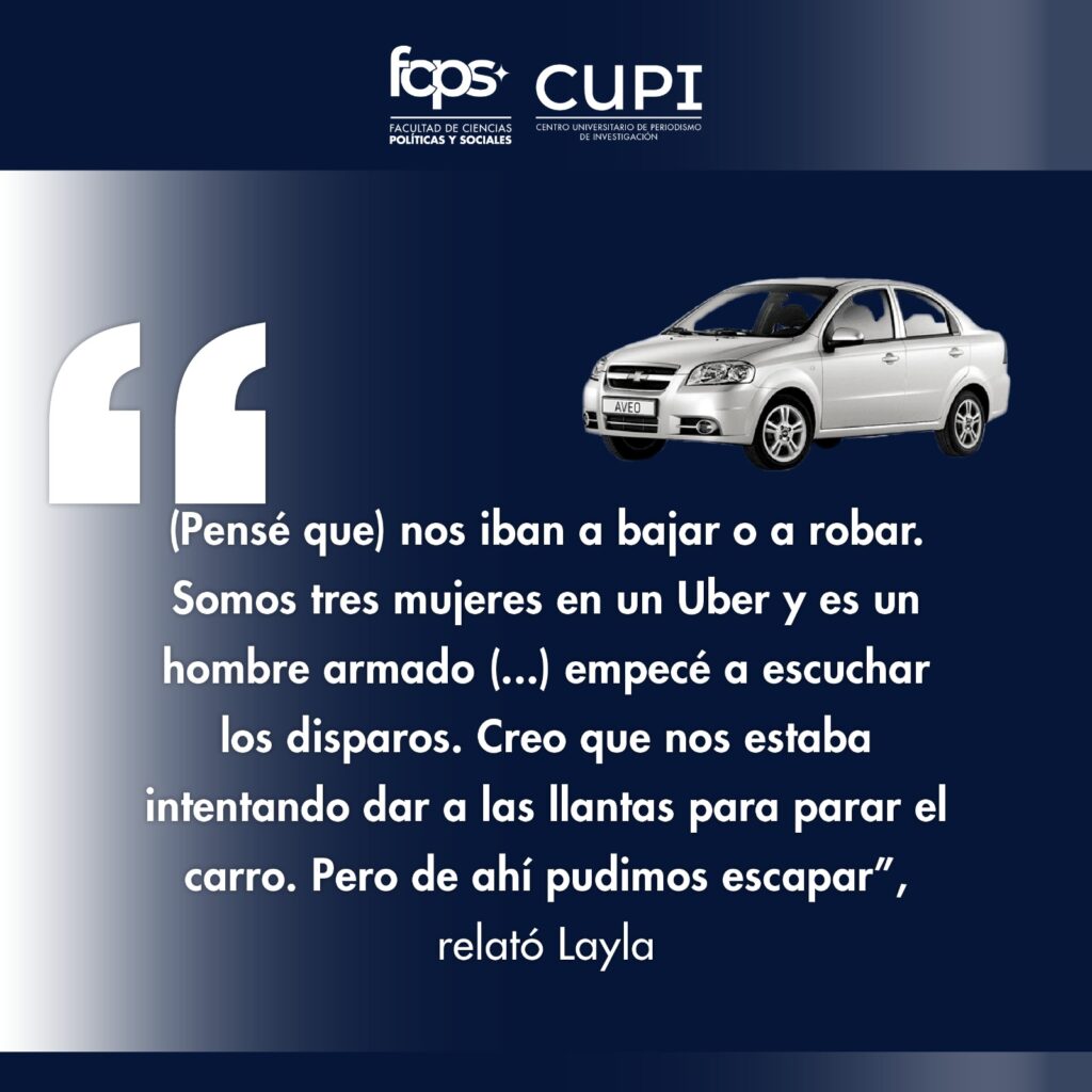 “Creí que nos iban a bajar o a robar. Somos tres mujeres en un Uber y es un hombre armado (…) De ahí le pegamos a un poste y a varias cosas, pero la verdad no sentí nada; no sé bien a qué fue todo lo que le pegamos. Cuando íbamos dando la vuelta empecé a escuchar los disparos; creo que nos estaba intentando dar a las llantas para parar el carro. Pero de ahí pudimos escapar”, relató Layla.
