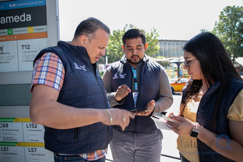 Poco antes del mediodía el calor ya golpea a quienes llegan a la Estación Alameda para abordar el transporte público. En medio del ir y venir de usuarios, Abraham, Erika y Verónica, Guardianes QroBús, orientan a quienes no saben qué ruta tomar, apoyan con recargas y atienden quejas para eficientar el servicio.