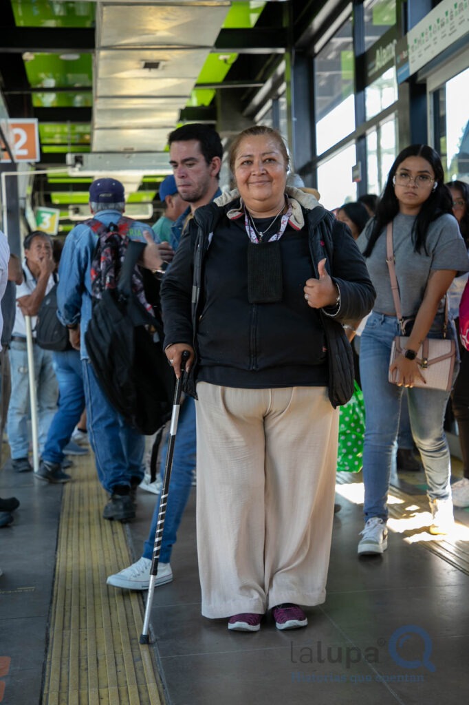 El bastón se convirtió en una herramienta de trabajo. Con él alcanza a apretar los botones en los marcos de la puerta si tardan en abrir o señalar algunas rutas a los usuarios. También entiende a la gente que a veces está enojada o frustrada, pero recuerda que su labor es ser empática con la gente y muchas veces eso cambia su actitud.