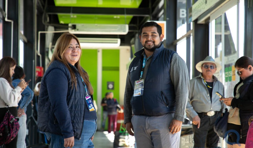 Poco antes del mediodía el calor ya golpea a quienes llegan a la Estación Alameda para abordar el transporte público. En medio del ir y venir de usuarios, Abraham, Erika y Verónica, Guardianes QroBús, orientan a quienes no saben qué ruta tomar, apoyan con recargas y atienden quejas para eficientar el servicio.