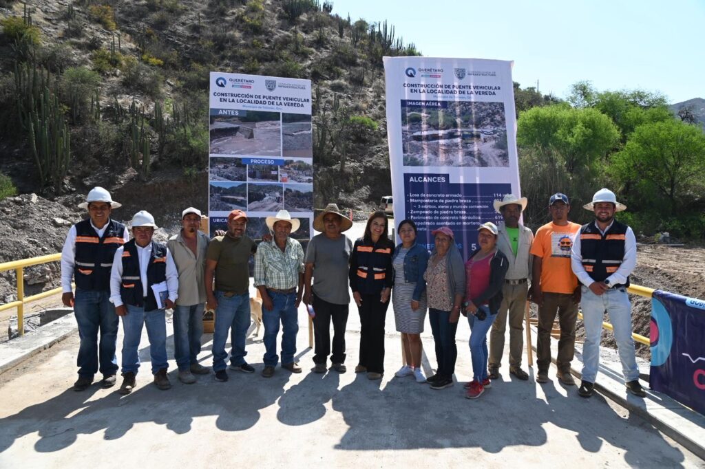 Tolimán, Qro., 11 de marzo de 2026.- Con un avance del 90 por ciento, la titular de la Comisión Estatal de Infraestructura (CEI), Sonia Carrillo Rosillo, supervisó la construcción del puente vehicular en la localidad de La Vereda, en el municipio de Tolimán, obra que contribuirá a fortalecer la seguridad vial y a mejorar los traslados de las familias de la región.