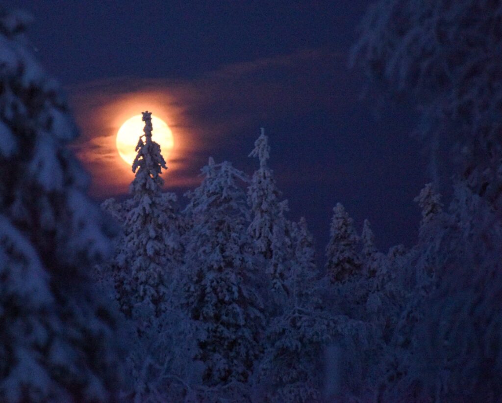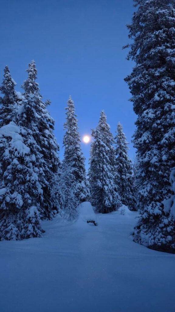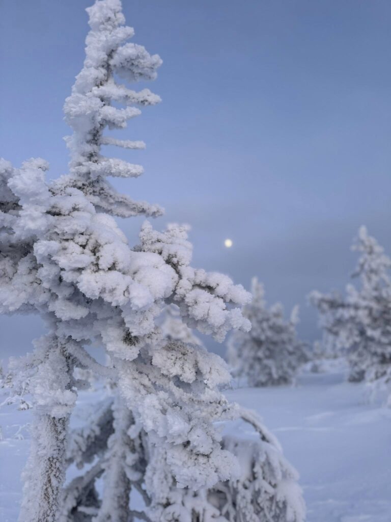 Cuando arribamos a Riisitunturi, segunda escala del viaje, las manecillas del reloj marcan las 14:45 horas, pero la luz del crepúsculo polar y una gigantesca luna llena, que dominan el panorama, dan al lugar un tono aún más surrealista y tiñen de azul y rosa estas formas abstractas. Lo mismo ocurre con el firmamento: el cielo se pinta de azul y violeta, colores que se reflejan en la nieve, creando una sobrecogedora atmósfera. No obstante, a nuestra derecha aún asoman débiles rayos de luz. Nos sentimos personajes de un documental de National Geographic.
