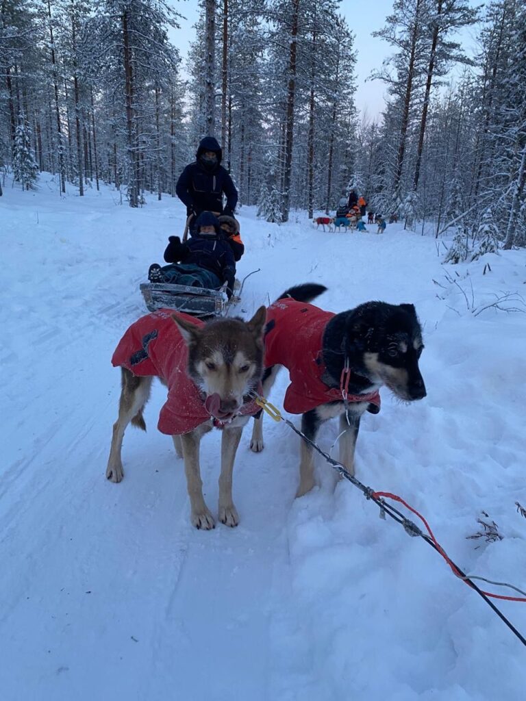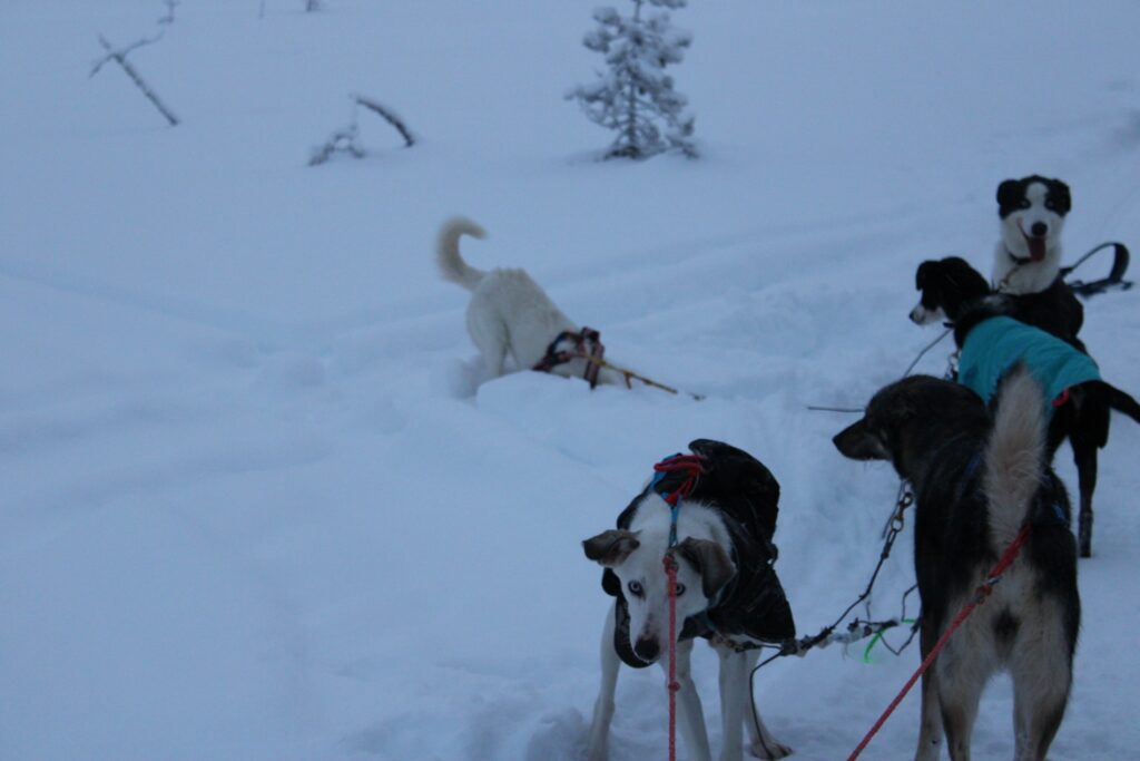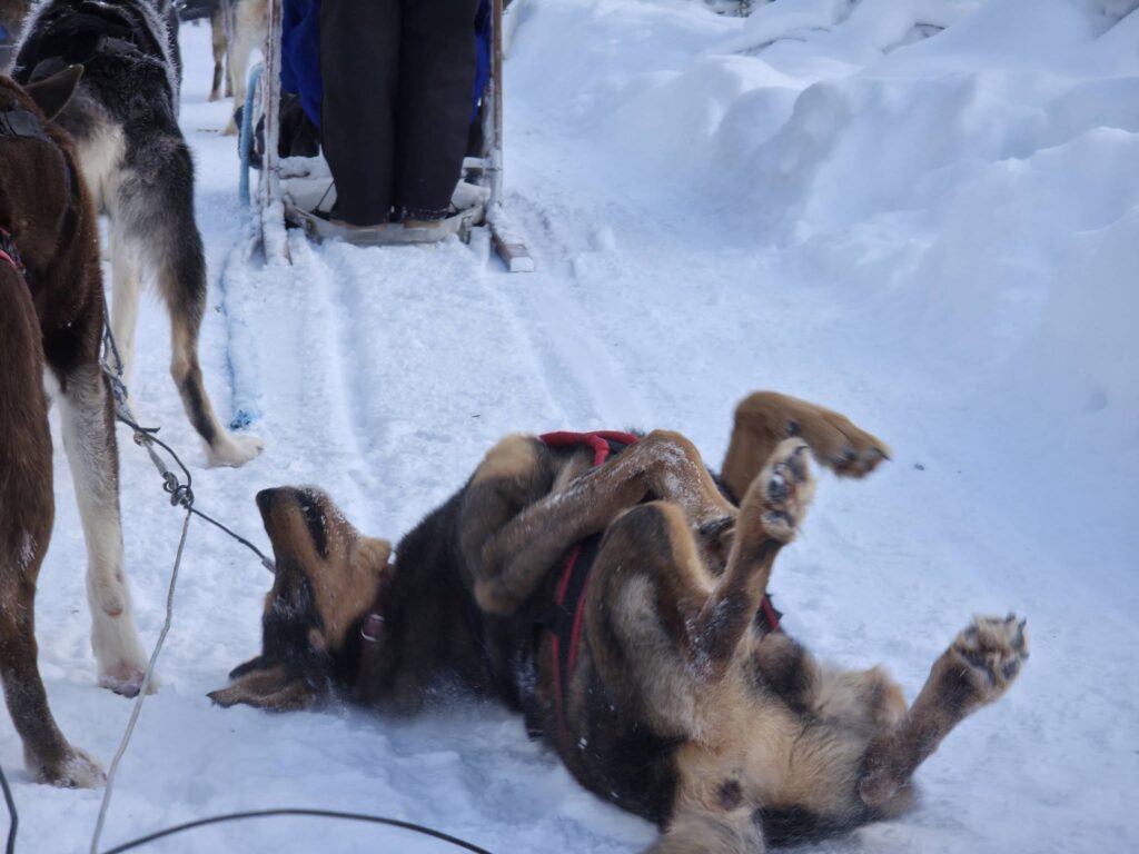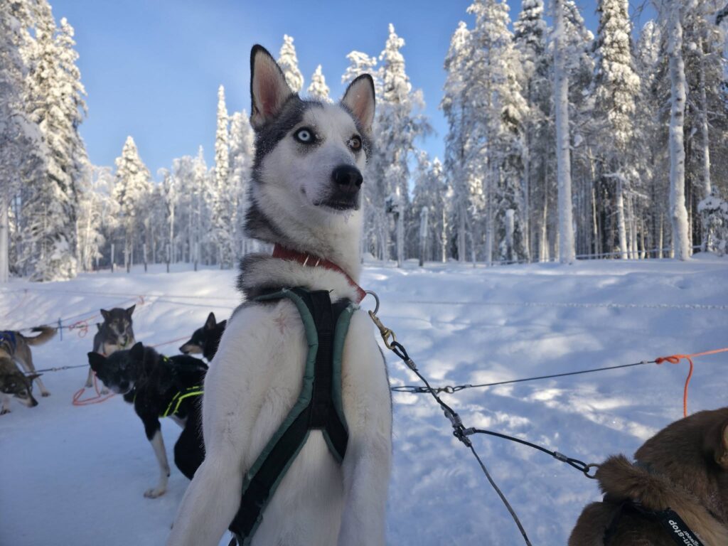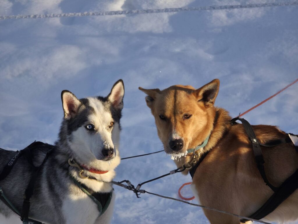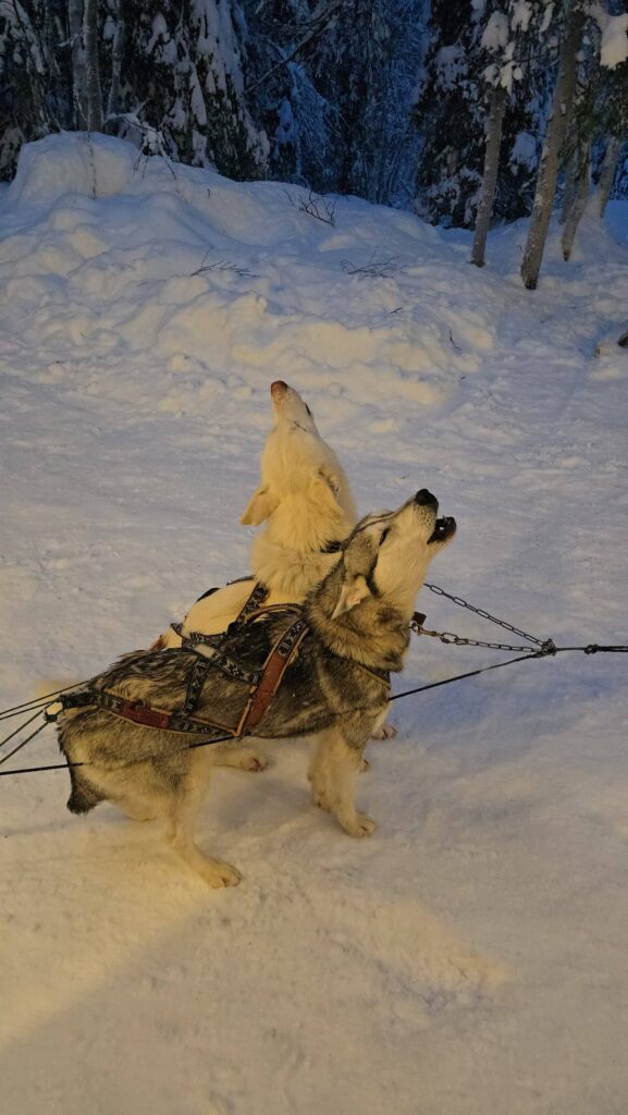 Nuestra llegada al campamento de los huskies, en la pequeña aldea de Narkaus, es anunciada por un coro de aullidos que rompe el silencio de la gélida mañana. Se trata de un grito heredado directamente de sus ancestros los lobos. A diferencia de otras razas que evolucionaron para ladrar como alerta, estos canes conservan el aullido como su herramienta social y de supervivencia. Y en este caso, aúllan y dan saltos bruscos y juguetones para expresar su euforia: queda claro que están ansiosos por empezar a correr.