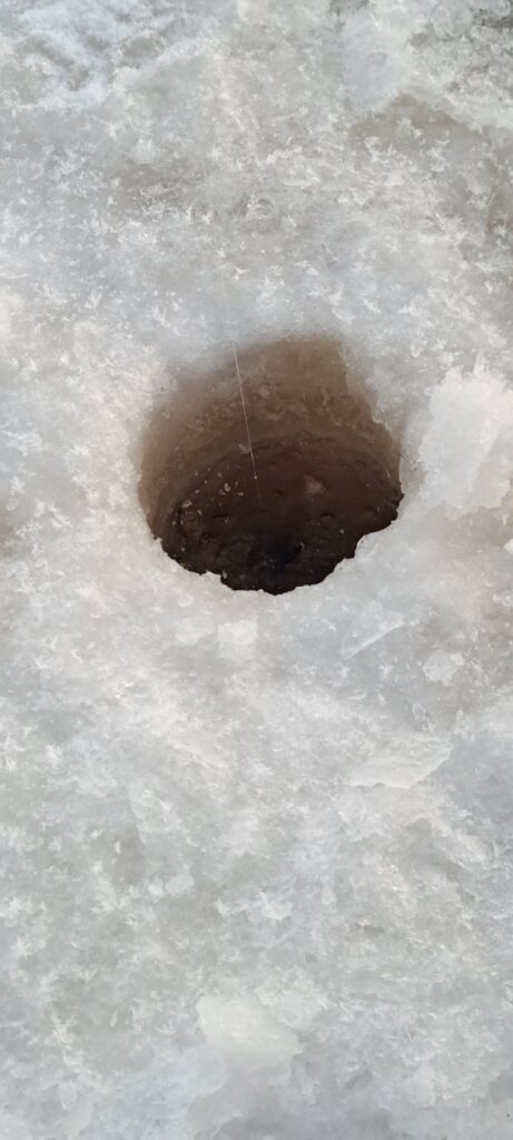 Por supuesto que el solo hecho de hallarnos sobre un lago congelado —caminar literalmente sobre el agua— tiene su dosis de emoción y una gran carga de adrenalina. Es como desafiar la lógica de la naturaleza. Sin embargo, lo que los “creativos” de las agencias turísticas omiten es que pescar en un sitio así implica esfuerzo físico, condiciones muy extremas, un alto grado de habilidad técnica y mucha paciencia, por lo que para unos novatos como nosotros las posibilidades de tener éxito son prácticamente nulas, aunque el curso intensivo de Lucas haya sido impecable.