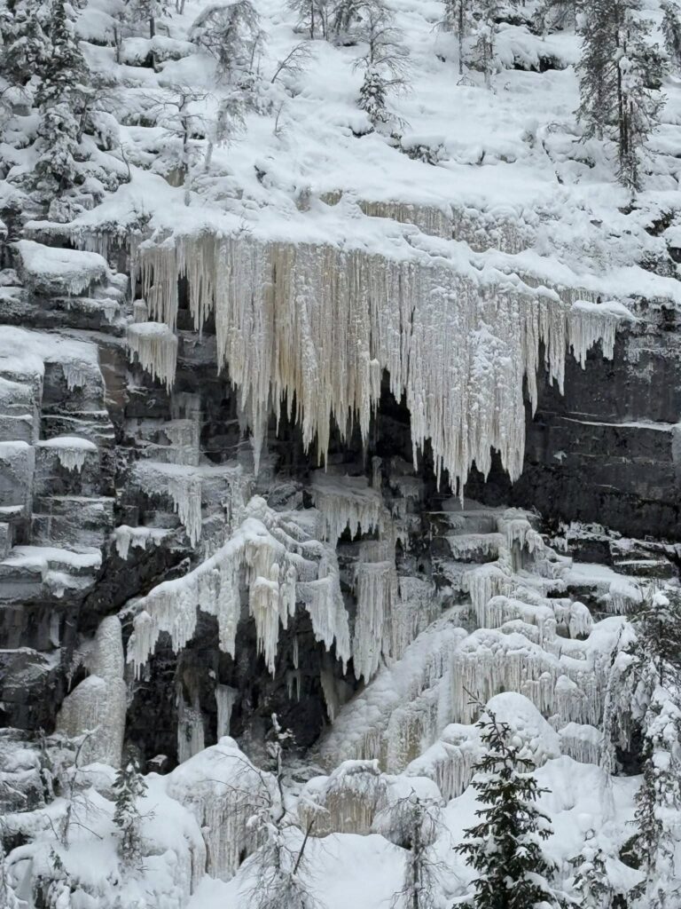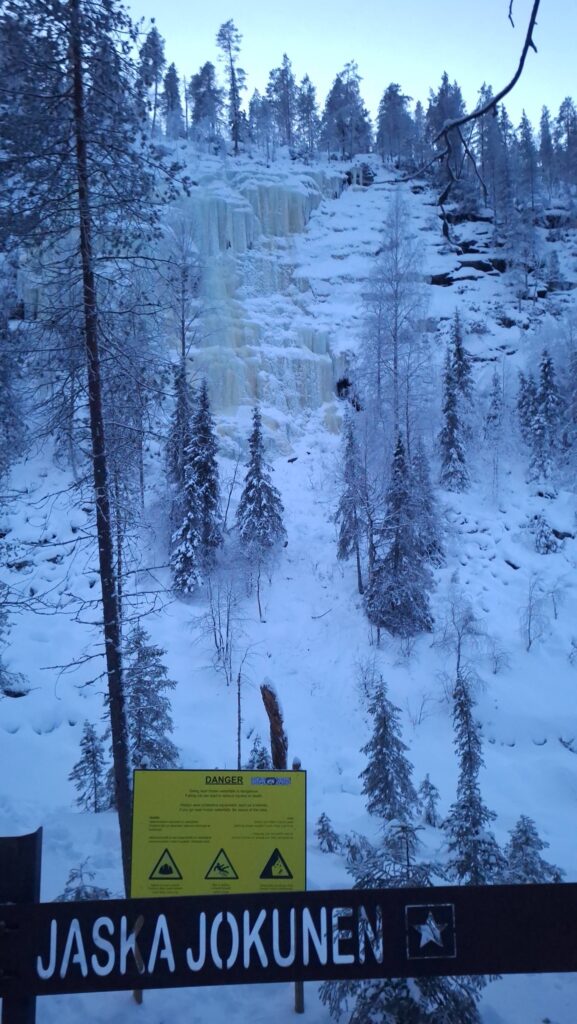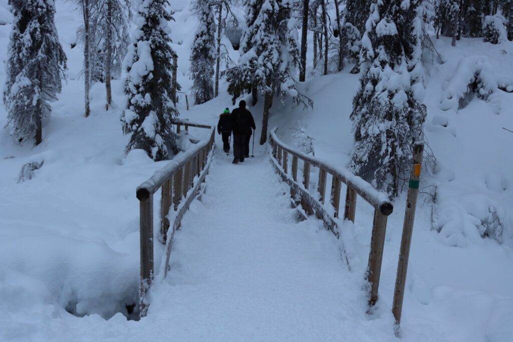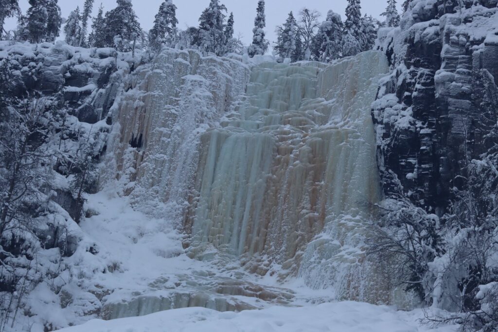 Descender hasta este cañón de ciento treinta metros de profundidad para admirar las tres grandes cascadas congeladas de impronunciables nombres —Ruskea Virta, Mammuttiputous y Jaska Jokunen— no es tarea fácil y puede llevarse hasta tres o cuatro horas. Se trata de una extenuante caminata de cinco kilómetros de ida y cinco de regreso que en invierno es aún más lenta y trabajosa por varios motivos: