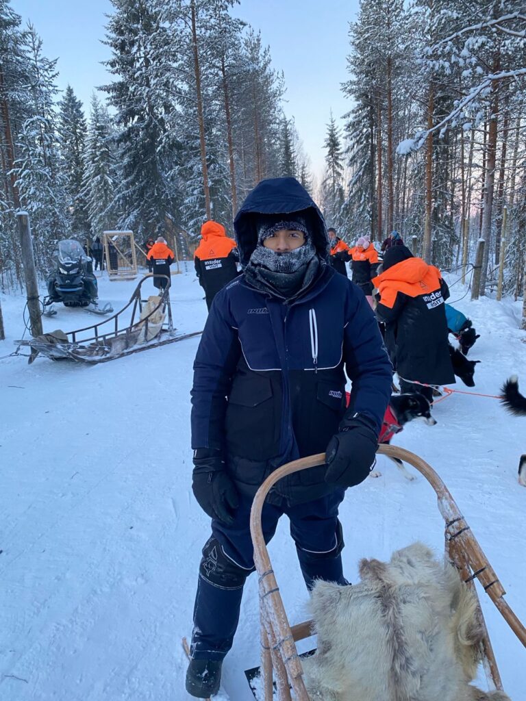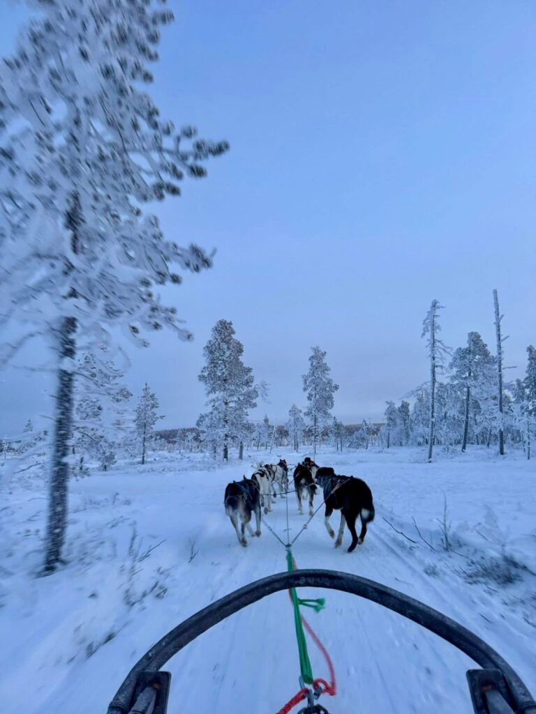 Arriba de la tarima, Onni continúa vociferando: “Hay una regla de oro para gobernar un trineo: nunca sueltes el manubrio. Pero, ojo, convertirse en un musher (conductor de trineo) va mucho más allá de sostenerse. La posición de los pies es vital: deben mantenerse siempre en los patines —estructuras alargadas sobre las que se desliza el trineo— con las rodillas flexionadas para absorber los impactos del hielo”. Además, nos advierte sobre la distribución del peso: “hay que inclinar el cuerpo hacia el interior de las curvas, como en una moto, para no volcar”. Y, un punto esencial —remata—: “aprendan a usar los dos frenos: el de alfombra, para reducir para reducir la velocidad gradualmente con un solo pie; y el de metal, para una parada total. En este último, hay que usar ambos pies y todo el peso del cuerpo”.