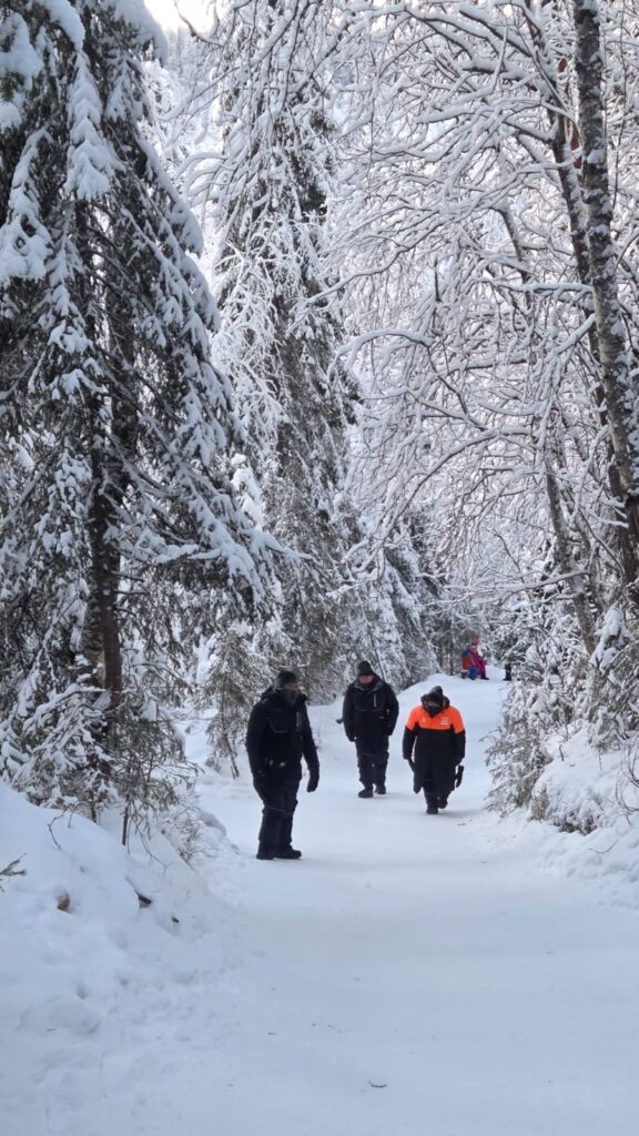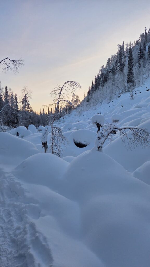 Se realiza en medio de la nieve profunda, lo que demanda mayor energía. El frío extremo no sólo cala los huesos y dificulta la respiración —pese a las capas térmicas y a la ropa especial—, sino que requiere de un esfuerzo extra y congela cejas, pestañas y cabello. Es un terreno con desniveles pronunciados, pues la ruta implica descender al corazón del cañón para luego ascender por senderos extremadamente resbaladizos. Dos aparatosos resbalones previos, en mero centro de Rovaniemi —más cómicos que riesgosos—, nos mantienen con el botón de alerta permanente en encendido. Sin embargo, no hay nada que lamentar. Los obligatorios crampones, las cuerdas en lugares estratégicos y la “técnica del pingüino” —pasos cortos y firmes, y el centro de gravedad hacia adelante— para evitar perder la vertical cumplen su cometido.
