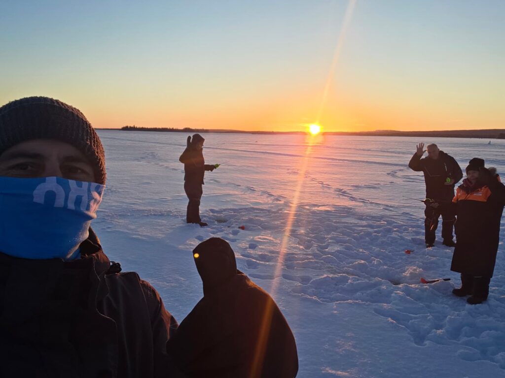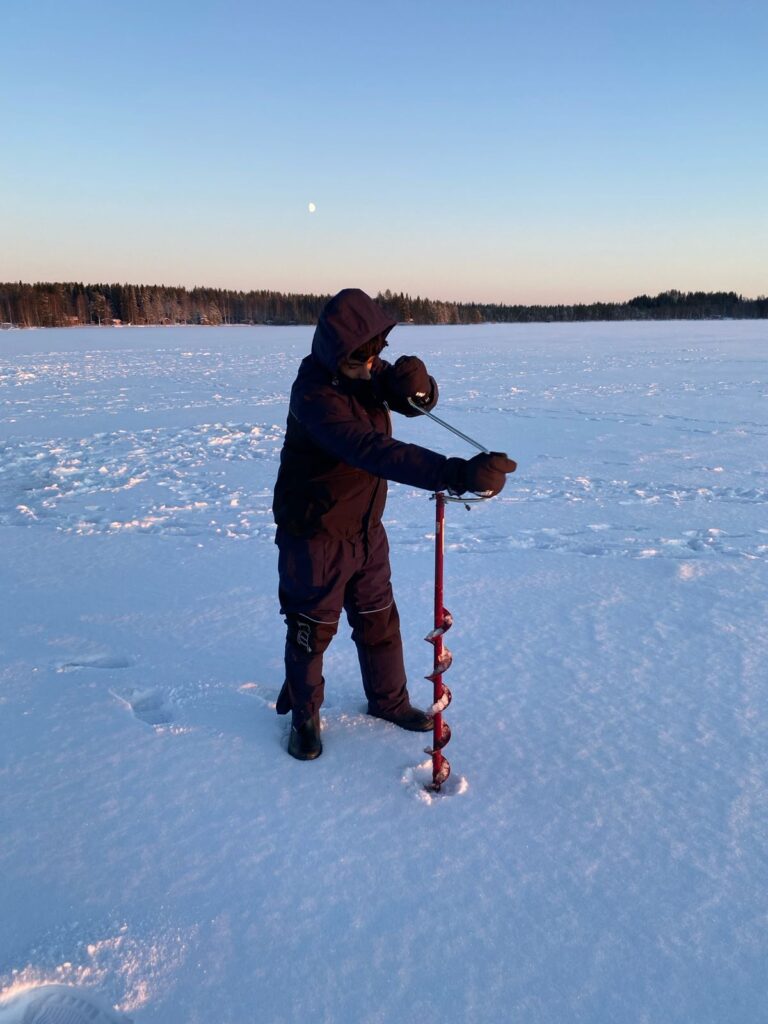 Actividad ancestral en Laponia, la pesca en hielo entre los sami data de la prehistoria. Antes de la domesticación masiva de los renos en el siglo XVI —un parteaguas para este pueblo—, ellos dependían casi exclusivamente de esta labor para obtener proteínas frescas durante los meses de invierno; el pescado seco era, además, su seguro de vida para las migraciones largas. Se trata, insisto, de una tarea extenuante que requiere perforar con una barrena el hielo sólido de al menos diez centímetros de espesor, usar cañas cortas y ligeras, cebos vivos y señuelos brillantes para atraer peces en aguas frías, y todo bajo este entorno de entre 30 y 40 grados bajo cero. Un detalle fundamental es el uso continuo de una pequeña pala para ir extrayendo los fragmentos de hielo que se forman en el orificio por la recongelación, y que amenazan con enredar el sedal y volver inoperante la perforación. Qué agotador. Además, el invierno reduce el oxígeno en el agua, lo que vuelve a los peces más lentos y difíciles de atraer. Sin embargo, antes de la invención de las barrenas los sami la tenían aún más complicada, pues tenían a la mano sólo herramientas rudimentarias: piedras afiladas, huesos grandes o cuernos de animales, y, más adelante, barras largas con un extremo afilado. Herramientas que harían que la barrena de Lucas pareciera un milagro tecnológico.