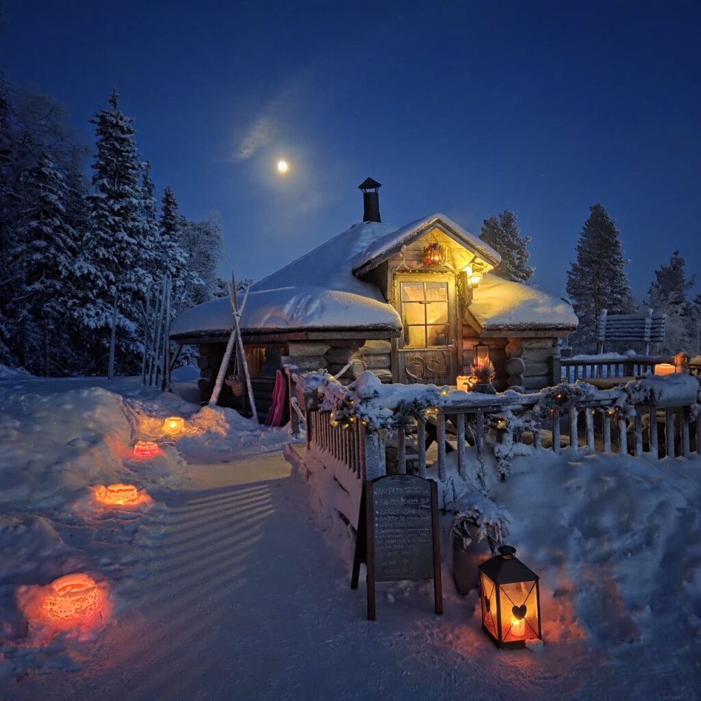 Nuestra meta es llegar hasta la colina principal que domina el valle. Sin embargo, tras cuarenta minutos de caminata decidimos dar media vuelta. El reloj apenas rebasa las 16 horas, pero la noche —que no penumbra, gracias a la luna llena— se ha adueñado de todo el paraje. La temperatura está bajando aún más —ya andamos cerca de los 35 grados bajo cero— y el viento, aunque ligero, “muerde” la cara. Sin embargo, ese no es el mayor problema. Son los diez kilómetros de senderismo en el cañón de Korouoma los que ya hacen mella. Son los efectos del jet lag los que, ahora sí, nos están pasando factura. Comenzamos a sentir un agotamiento extremo, nos duelen los pies y ya no sentimos los tobillos. Tenemos hambre y, sobre todo, sed. Hay voluntad, pero el cuerpo ya no responde. Salimos del parque, rumbo al estacionamiento, y, de pronto, la vemos, y nos quedamos boquiabiertos: se trata de una cabaña de madera que en este entorno polar parece como salida de una postal de algún tiempo pretérito. Dudamos por unos segundos si quedarnos afuera o entrar. Pero hay algo que termina con nuestros titubeos. Recargado sobre la cerca frontal se encuentra un pizarrón: “Riisitunturin Tupa. Cálido y acogedor: Menú del día: sopa de reno o sopa de salmón con queso, pan de centeno, rollos de canela, pastel de arándanos, chocolate caliente, té y café”. Comenzamos a salivar. Empujamos la puerta e ingresamos.