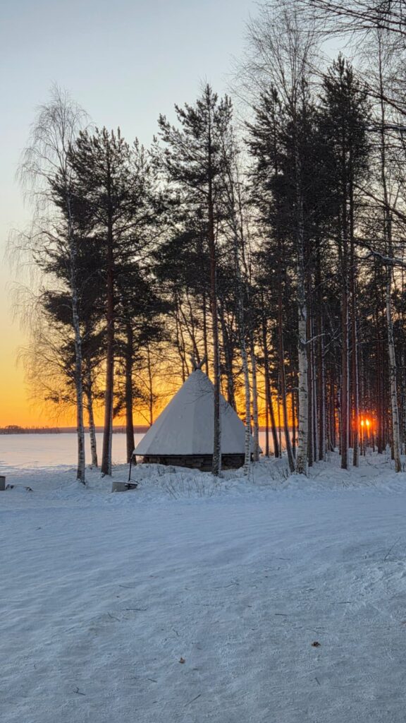Después de digerir nuestra “derrota”, nos instalamos en una láavu, un refugio abierto de madera, donde Lucas asó bombones y salchichas, como menú de consolación, y preparó un gran fuego que, pese a su tamaño, no logró calentar el ambiente por completo. Allí recibimos un obsequio más del gélido norte que sin obstáculos visuales —ni árboles ni colinas— pudimos observar en toda su magnitud: en invierno, por estas latitudes, el sol no llega a elevarse sobre el horizonte, creando un crepúsculo perpetuo. Lo contemplamos, anonadados: el pálido disco dorado se desplaza lateralmente. Como consecuencia, la débil luz no cae desde arriba sino que viaja horizontalmente; es un largo, largo ocaso. Al estar el sol tan bajo, los rayos golpean la superficie del lago de forma lateral, logrando un efecto visual hipnótico: la superficie no se ve blanca, sino que parece salpicada de escarcha luminosa, son los cristales de la nieve. Lucas lanzó, entonces, una frase muy certera: “es como si nuestra estrella se negara a terminar de nacer o de morir”.