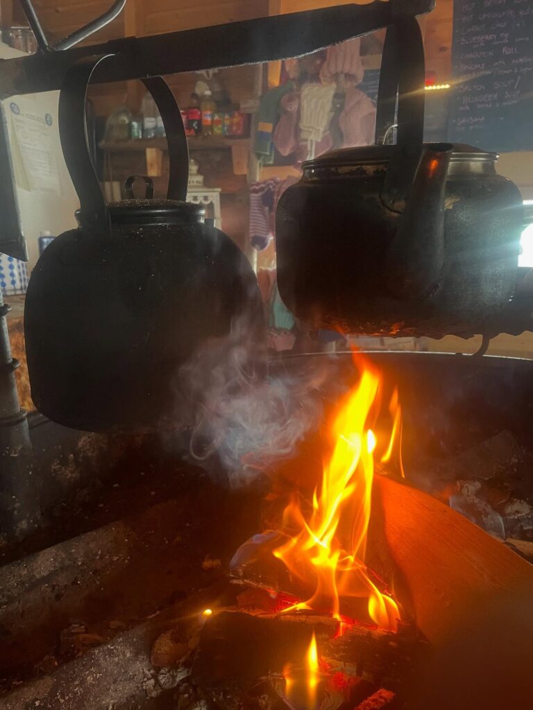El lugar es pequeño, pero fiel a su eslogan. Un refugio confortable donde recobrar fuerzas tras la extenuante fatiga de periplos trasatlánticos y caminatas invernales. En el interior, hay casa llena. Unas treinta personas se congregan alrededor de las mesas de madera, caldeadas por un enorme fogón de forma circular que preside el centro del salón. Sobre ese mismo fuego se terminan de cocer los alimentos y borbotean las bebidas. Al instalarnos en un rincón, se nos acerca un hombre de unos sesenta años. Su tez morena y marcados rasgos latinos contrastan con el entorno. Nos ofrece el menú con presteza y nos atiende en un inglés impecable, pero al escucharnos cuchichear en español, su rostro se ilumina y, de inmediato, nos saluda en nuestro idioma, sumamente afable y con un acento caribeño.