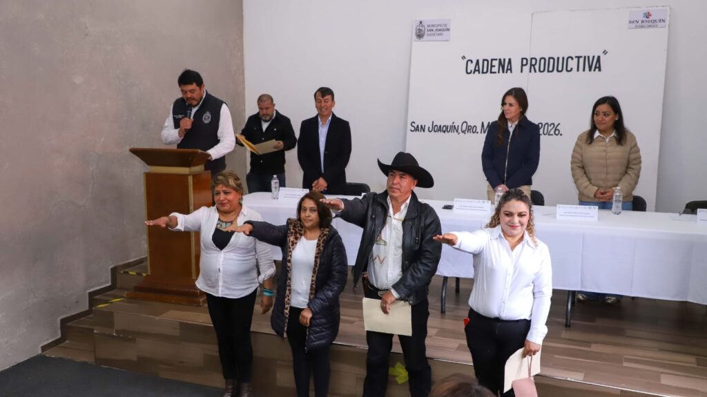 Querétaro, ,Qro., 17 de marzo de 2026.- Como parte de las acciones para fortalecer la competitividad y organización del sector turístico, se llevó a cabo la toma de protesta de la Cadena Productiva del Pueblo Mágico de San Joaquín, integrada por prestadores de servicios turísticos comprometidos con el desarrollo del destino, en una ceremonia encabezada por la secretaria de Turismo, Adriana Vega Vázquez Mellado, y el presidente municipal, Carlos Manuel Ledesma Robles.