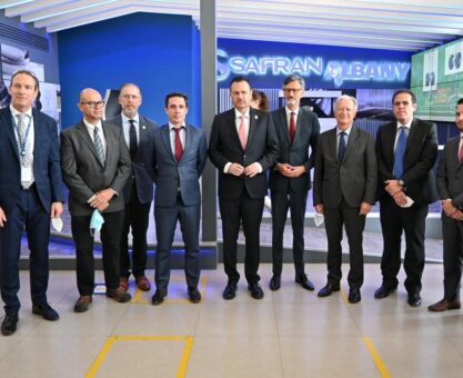 Kuri visita plantas de Safran en el Parque Aeroespacial Querétaro con funcionarios franceses